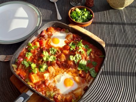 The days are warm, so we are still enjoying breakfasts on the balcony most mornings. I made Shakshuka, for the first time this week, a Mediterranean breakfast dish. Fried eggs on top of a brightly coloured fresh pepper stew. I highly recommend it!