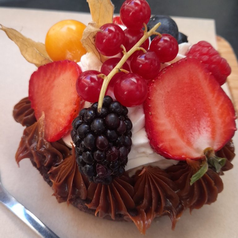 I finally chose a tart, with a dark chocolate crisp pastry base, filled with vanilla cream, topped with fresh strawberry, blackberry, red and black currants. It tasted as good as it looked!.