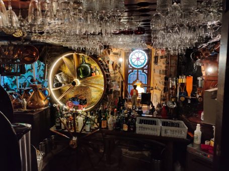 We sit on high stalls at its small glitzy bar. Watching the bartender, as he prepares our mix of Valencian orange, Cava, vodka & gin!