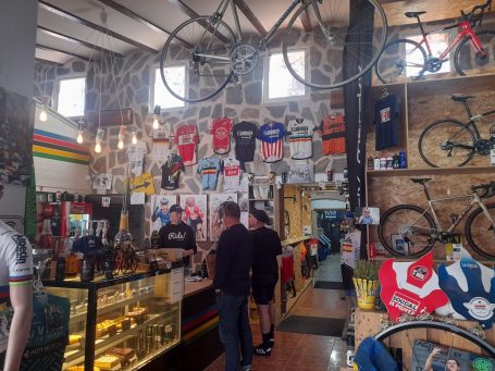 We saw Dutch, French, Belgian, German and English teams, it felt very continental. The place was decorated with oversized photos of famous cyclists and races, with vintage bikes hanging from the ceiling.
